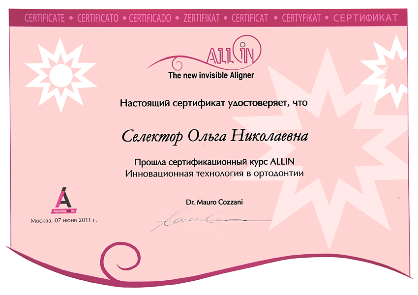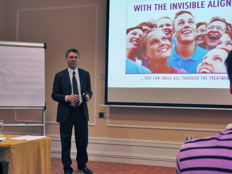 7 июня 2011г в гостиннице Radisson Royal Hotel прошел сертификационный семинар фирмы All-In Invisible. All-In Invisible — система, позволяющая провести изменения положений зубов с помощью прозрачных, очень тонких капп. По сравнению с брекетами, они совершенно незаметны для окружающих и пациент может снять их в любое время (например для приема пищи или чистки зубов). Семинар проводил ведущий мировой ортодонт — доктор Mauro Cozzani (Италия). Все участники семинара получили сертификат международного образца с индентификационным номером, что дает право работы с системой All-In Invisible в любой стране мира.